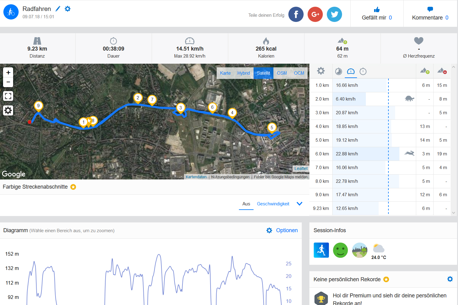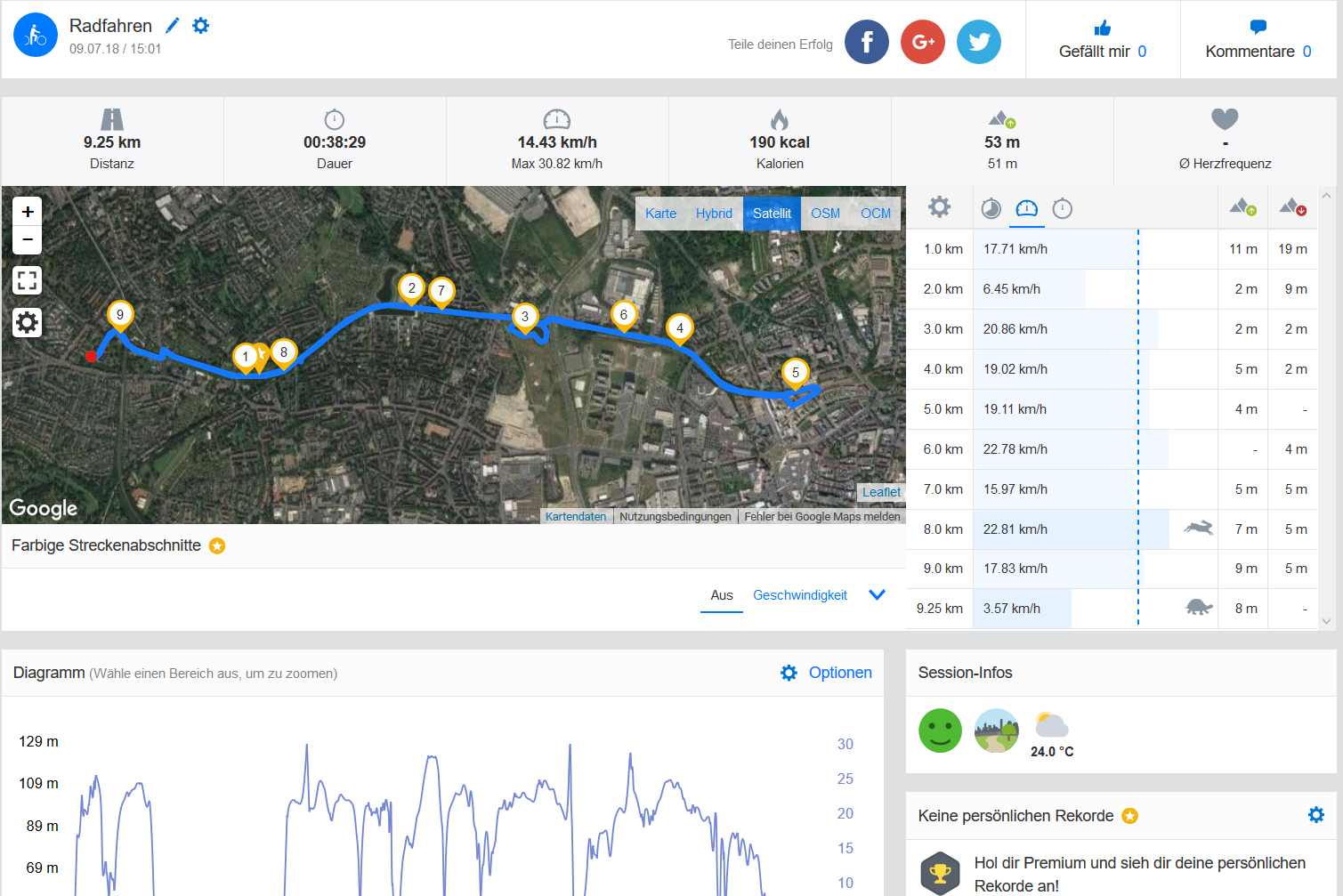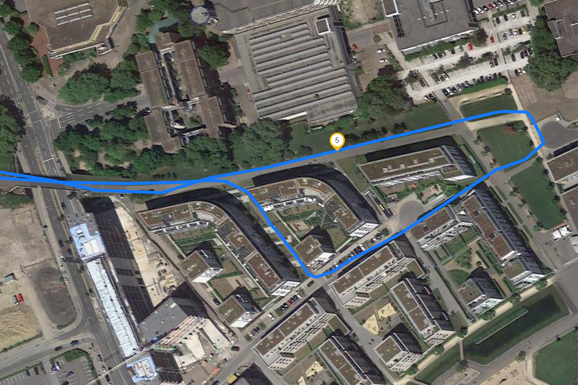 Auf unserer obligatorischen Fahrradtour vergleichen wir das LG K9 mit unserem Referenzgerät Garmin Edge 500. Die aufgezeichnete Strecke zeigt, dass das K9 eine ähnliche Qualität erreicht, wie der GPS-Fahrradcomputer und lediglich bei sehr engen Kurven etwas ungenauer ist. Für Navigationsaufgaben ist das LG K9 daher gut geeignet.
