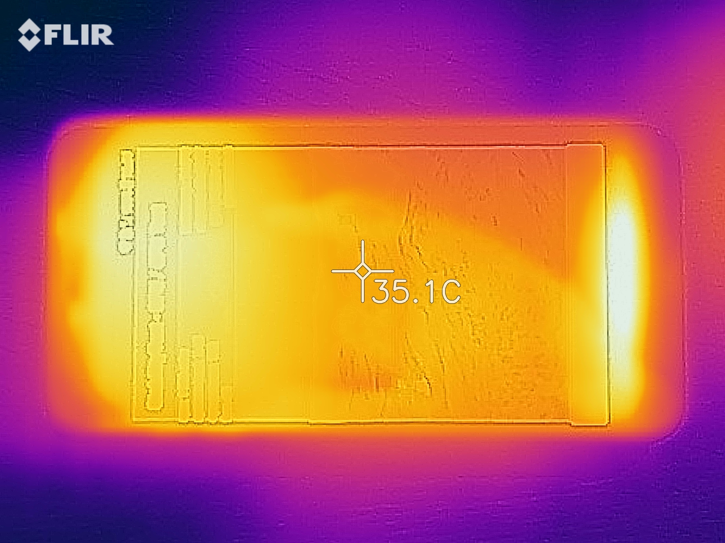 (+) Auf der Unterseite messen wir eine maximalen Wert von 36.4 °C (im Vergleich zum Durchschnitt von 34 °C).