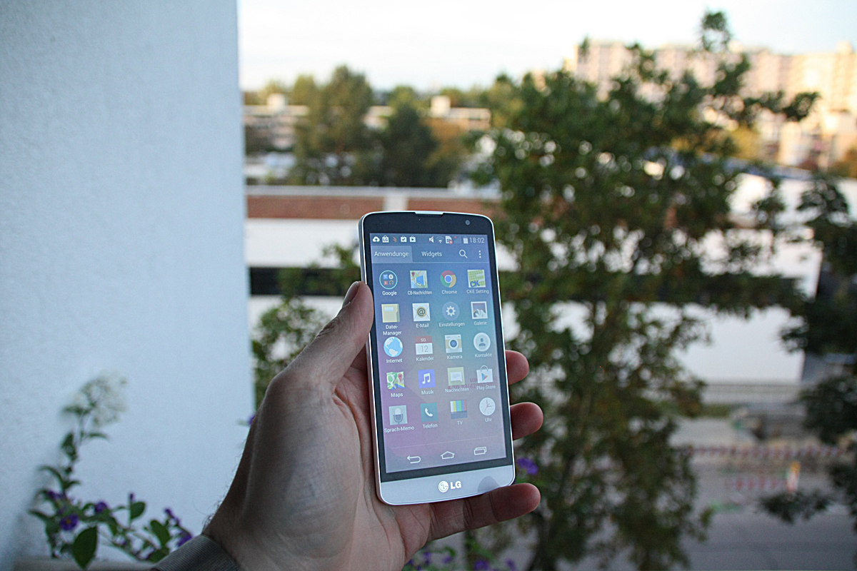 Der spiegelnde Bildschirm ist ein Nachteil im Freien, andererseits ist er allen Smartphones gemein. Die recht hohe Helligkeit des LG L Bello andererseits macht es durchaus möglich, das Smartphone auch in helleren Umgebungen zu verwenden. In direktem Sonnenlicht allerdings sind die Spiegelungen zu stark, als dass man noch etwas erkennen könnte.