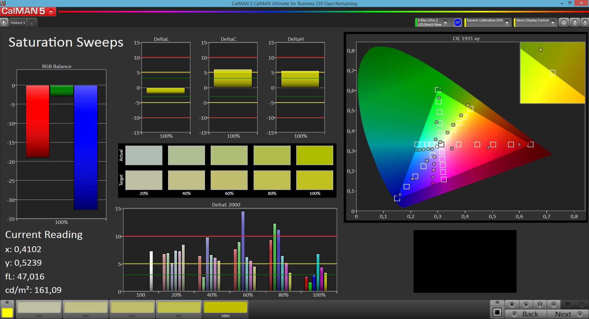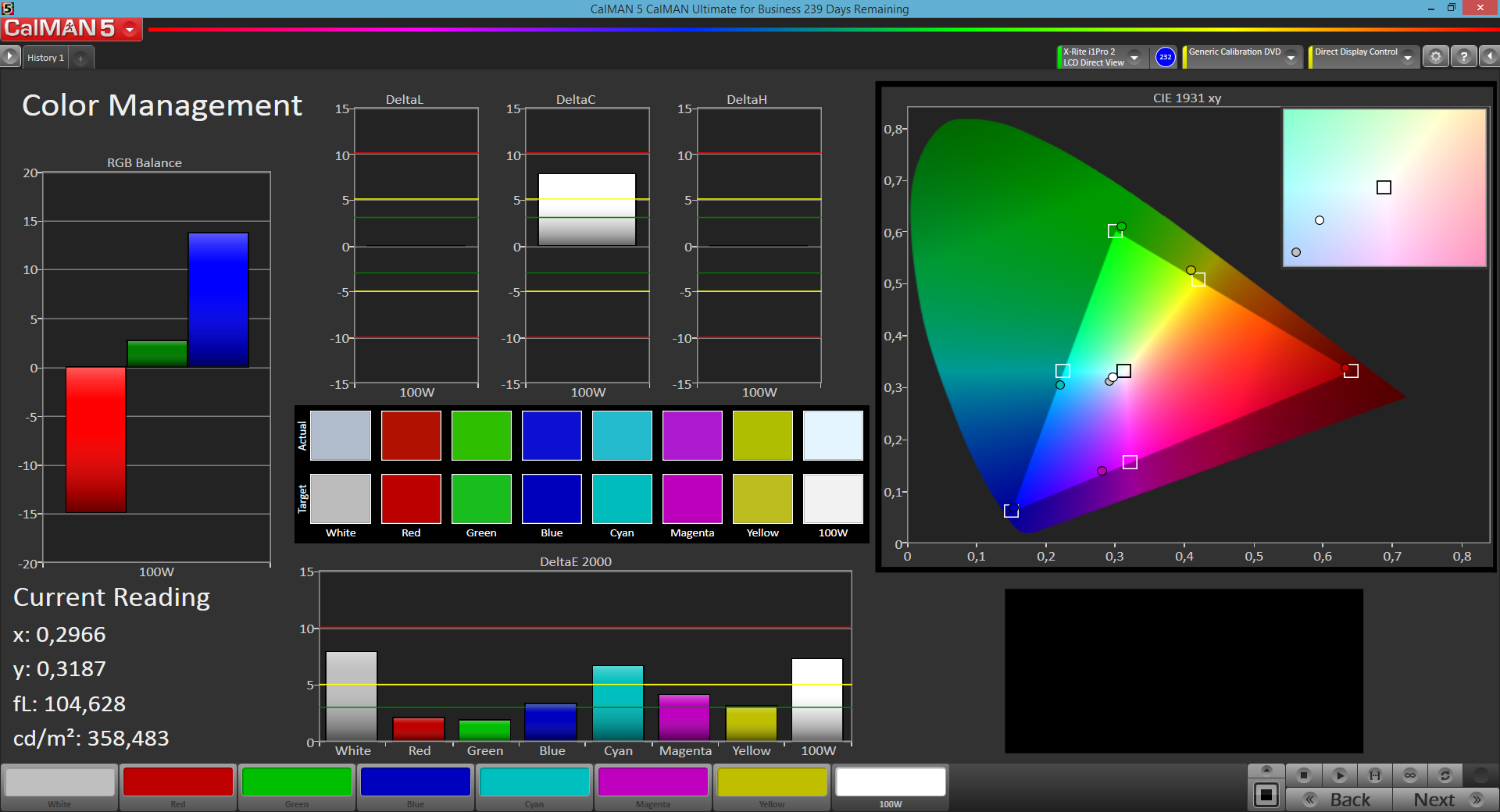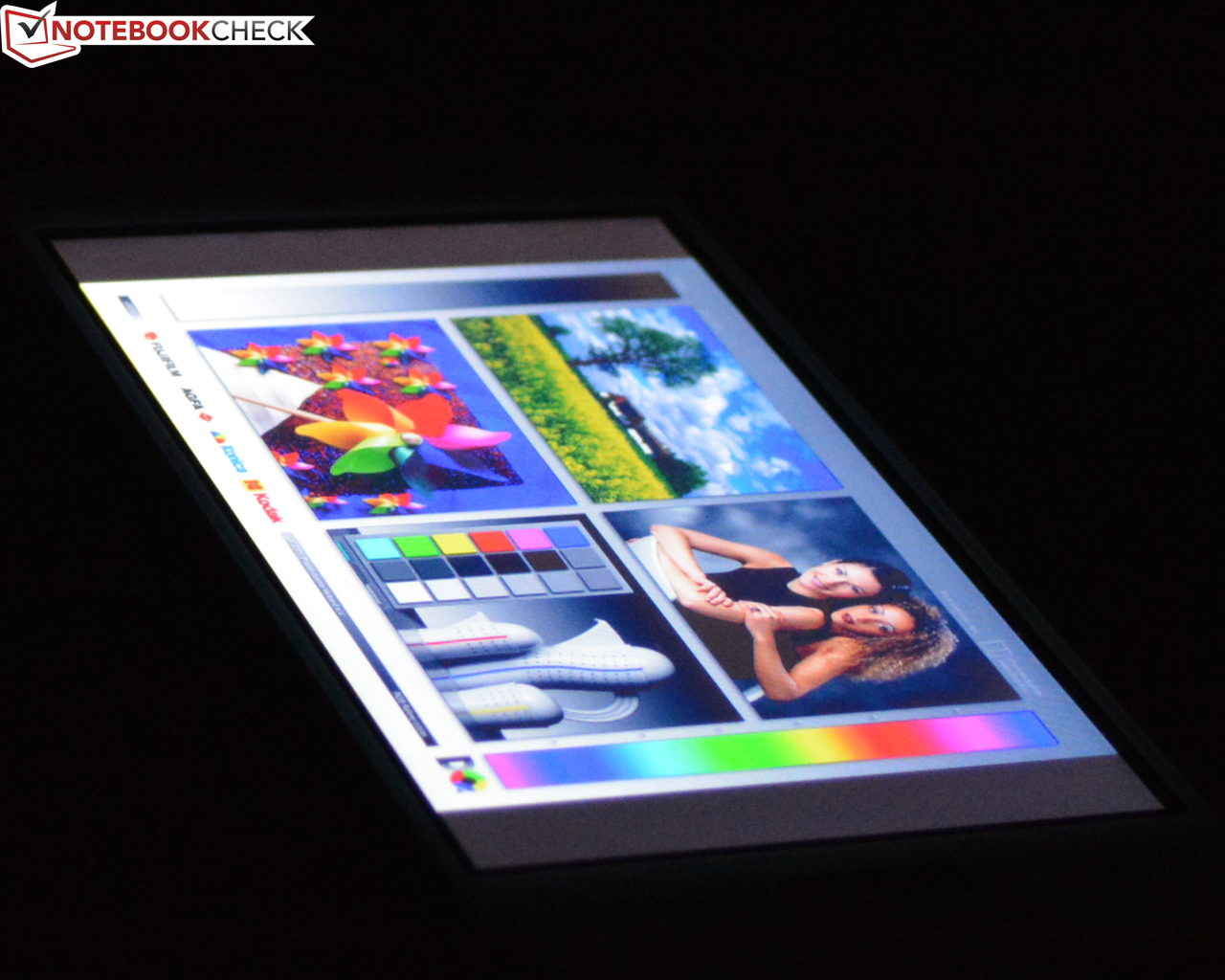Die Messungen mit dem Kolorimeter X-Rite i1pro 2 und der Software CalMAN zeigen, dass rote Farbtöne etwas zurückgenommen dargestellt werden, Blautöne geraten dafür zu kräftig. Bei den Mischfarben offenbart sich ein etwas zu hohes DeltaE von 7,17, außerdem weisen Farben einen leichten Stich ins Grün-Gelbe auf. Ein Gamma von 2,5 und eine Farbtemperatur von 10.363 K sind deutlich zu hoch. Das DeltaE der Graustufen ist mit 7,42 ebenfalls zu hoch. Der Graustufenverlauf weist einen deutlichen Blaustich auf. Subjektiv fallen diese Defizite im Alltagsbetrieb dennoch kaum auf.