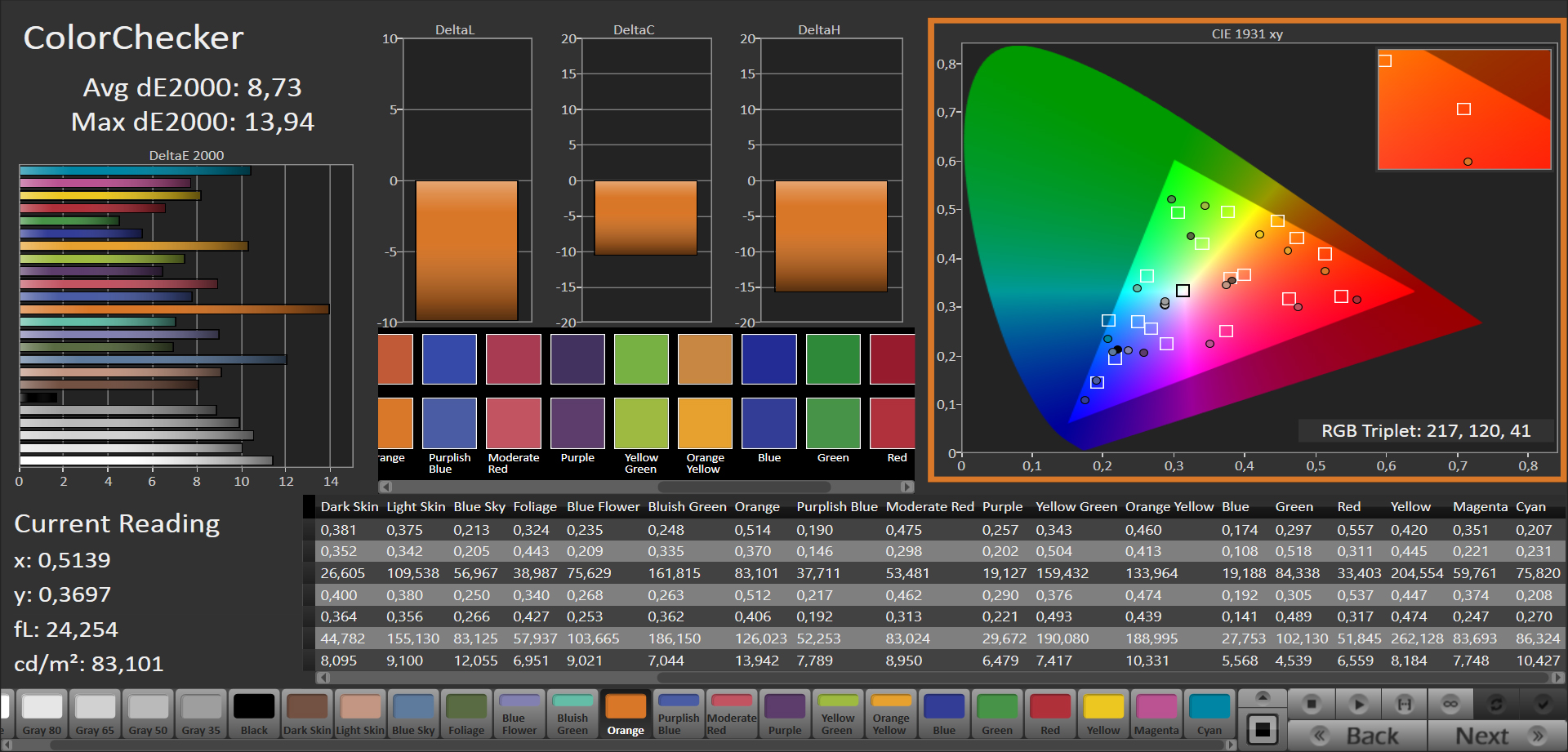 ΔE ColorChecker Calman: 8.73 | ∀{0.5-29.43 Ø4.78}