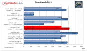 Beim Smartbench 2011 werden zwei Werte ermittelt: zum einen der für Productivity- und zum anderen der Game-Index. Mit 3.089 Punkten - im Game-Index - musste sich das V900 Optimus nur dem Xoom von Motorola (3.652 Score) geschlagen geben. Beim Index für Productivity schaffte das V900 Optimus, mit einem Score von 2.537, nur den dritten Platz. Auf den besseren Plätzen landeten das Samsung Galaxy Tab 10.1v und wiederum das Motorola Xoom.