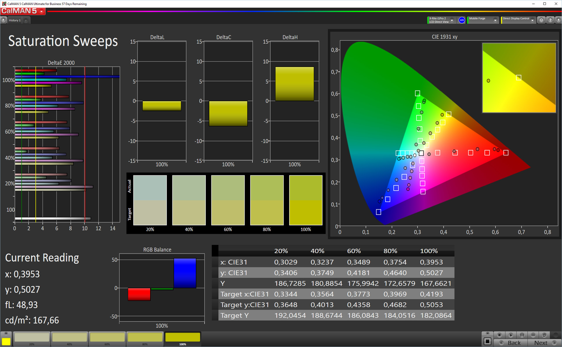 Die genauere Analyse der Farbwiedergabe erfolgt mit der Software CalMAN und dem Spektralfotometer. Hier zeigen sich leider sehr starke Abweichungen und ein krasser Blaustich. Subjektiv wirken Farben auf dem Display recht blass und kalt, man kann aber über den "Lesemodus" eine wärmere Farbtemperatur einstellen.