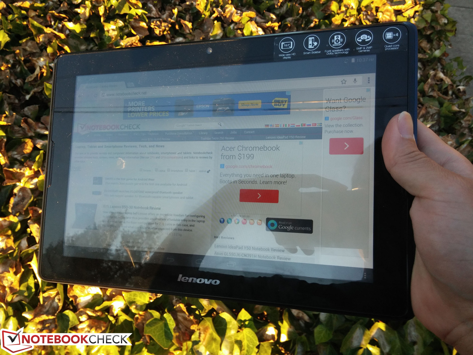 Die Outdoor-Tauglichkeit ist für ein günstiges 10,1-Zoll-Tablet ziemlich gut. Das geringe Gewicht und das helle Display sind Vorteile gegenüber Acers schwereren Iconia Modellen und anderen Geräten. Die maximale Helligkeit wird im Akkubetrieb nicht reduziert, somit stehen dem Anwender die vollen 330 cd/m² zur Verfügung. Wir empfehlen eine hohe Helligkeitseinstellung, um Spiegelungen unter direktem Sonnenlicht so weit wie möglich zu kompensieren.