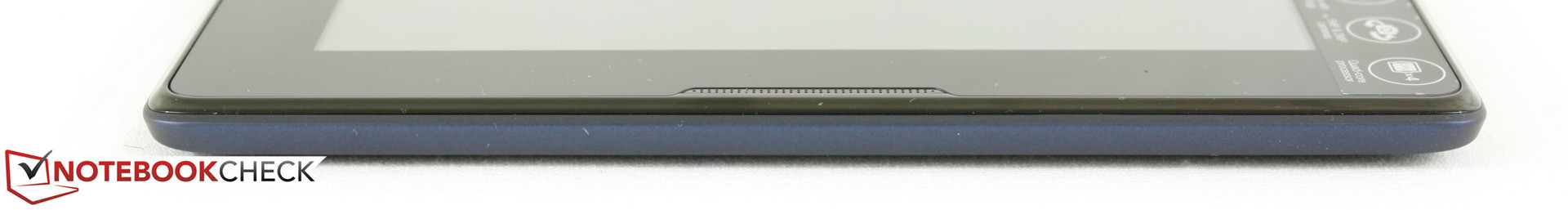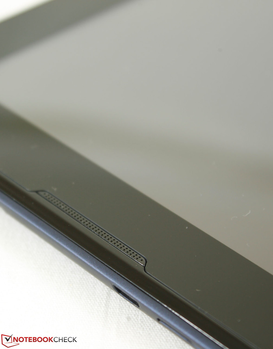 Die beiden Stereolautsprecher auf der Vorderseite sind zum Anwender gerichtet und produzieren einen ausreichend lauten Klang mit nur geringen Verzerrungen und ohne Vibrationen. Der nicht vorhandene Bass führt zu einer schlechten Balance, denn Stimmen klingen höher als normal, wohingegen tiefe Töne beinahe gar nicht zu hören sind.