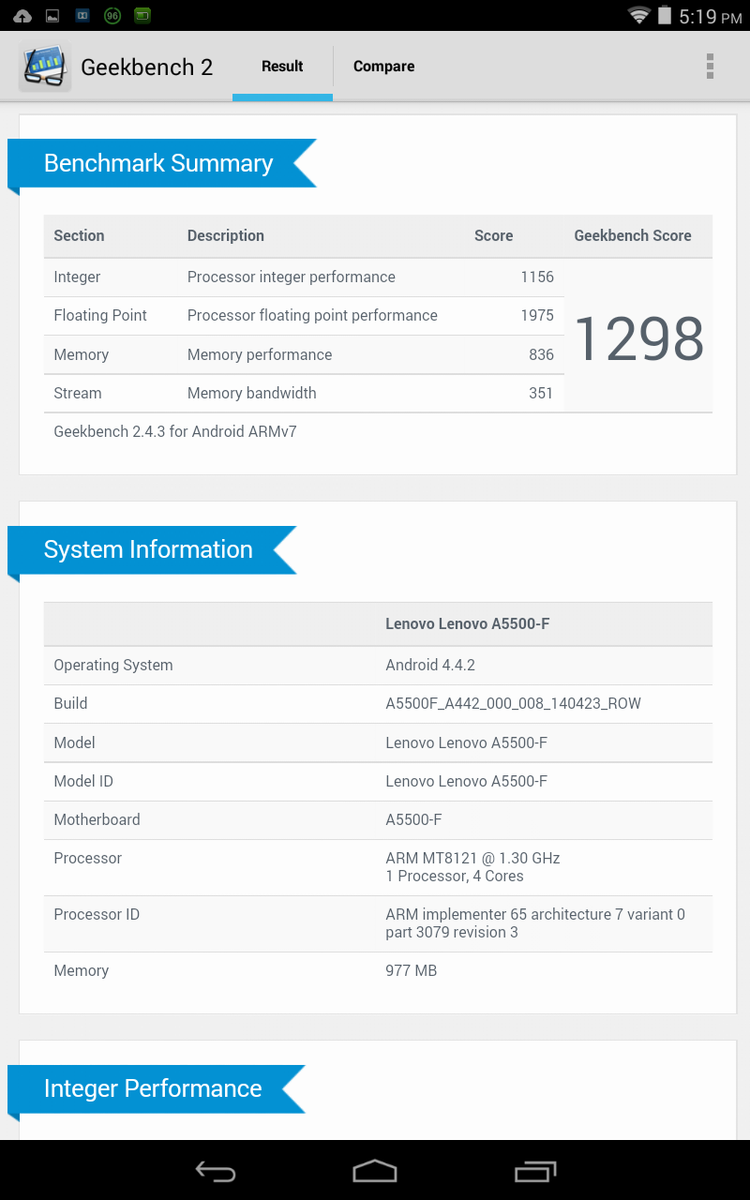 Der MediaTek MT8121 ist ein Quad-Core-SoC der Einstiegsklasse und läuft mit 1,3 GHz. Der SoC basiert auf dem Cortex-A7-Standard und integriert Bluetooth 4.0, WiFi sowie GPS. In Sachen Leistung ist der Chip dem MT8317T Dual-Core-Prozessor des A1000 deutlich überlegen: Während der Dual-Core lediglich 900 Punkte in Geekbench 2 erreichte, schafft der MT8121 beinahe 1.300 Punkte, was einem Vorteil von rund 45 % entspricht. Das Yoga Tablet 8 mit dem MediaTek MT8389 erreicht ebenfalls 1.300 Punkte. Selbstverständlich spielt ein Tablet wie das Galaxy Tab Pro 8.4 mit seinem deutlich leistungsfähigeren Snapdragon 800 in einer anderen Liga, was der Herausforderer in Geekbench 3 eindeutig unter Beweis stellt: Mit 915 und 2.782 Punkten (Single-Core/Multi-Core) liegt es deutlich vor dem Tab A8 mit lediglich 351 bzw. 1.156 Punkten.