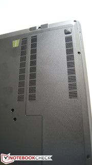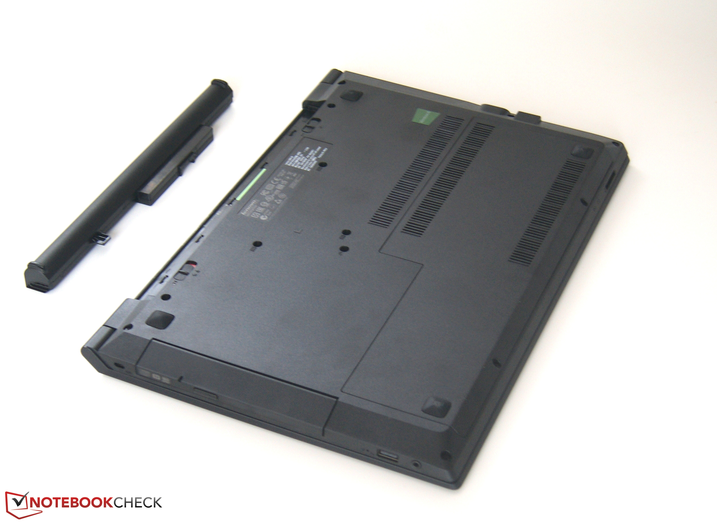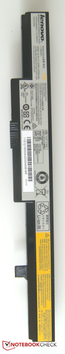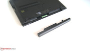 Der eingebaute 4-Zellen Li-Ion Akku kommt mit 32 Wh aus, welcher folglich 5 Wh unter der Konkurrenz liegt. Durch den geringen Durchmesser des austauschbaren zylindrischen Akkus, wirkt dieser ziemlich klein dimensioniert.