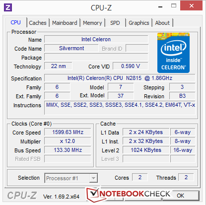 Die im Lenovo verbaute Intel Celeron N2815 verfügt über einen Takt zwischen 1.860 - 2.133 MHz und findet größtenteils Platz in Netbooks. Mit einem TPD von 7,5 Watt ist die Leistungsaufnahme niedrig angesetzt.