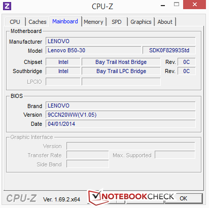Die in der Intel Celeron N2815 verbaute Intel HD Graphics (Bay Trail) ist eine reduzierte Version der Intel HD Graphics (Sandy Bridge) und verfügt über einen geringeren Takt von 311 - 896 MHz und ausschließlich vier Piplines (anstelle von sechs). In unserem Fall konnten wir einen dynamischen Taktwechsel zwischen 400 - 755,6 MHz feststellen. Anbindung findet die Bay Trail-Version überwiegend in Netbooks oder Tablets und selten, wie auch hier, in Notebooks. Weiterführende Informationen und Benchmarks können aus unserer Grafikkartensektion entnommen werden. In unserer Testprozedur hat uns das Lenovo einige Probleme bereitet, so konnten wir keinen 3DMark 06 durchführen, da der installierte Treiber von Lenovo nicht zertifiziert war und nur diese Lenovotreiber installierbar sind. Hinzu mussten Hintergundprogramme geschlossen werden, da dies sonst einen Abbruch des Test, aufgrund zu geringer Arbeitsspeicherressourcen, zur Folge hatte.
