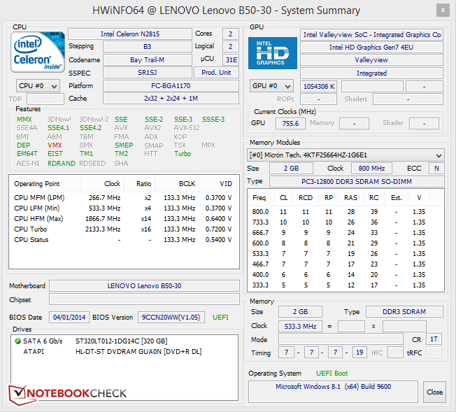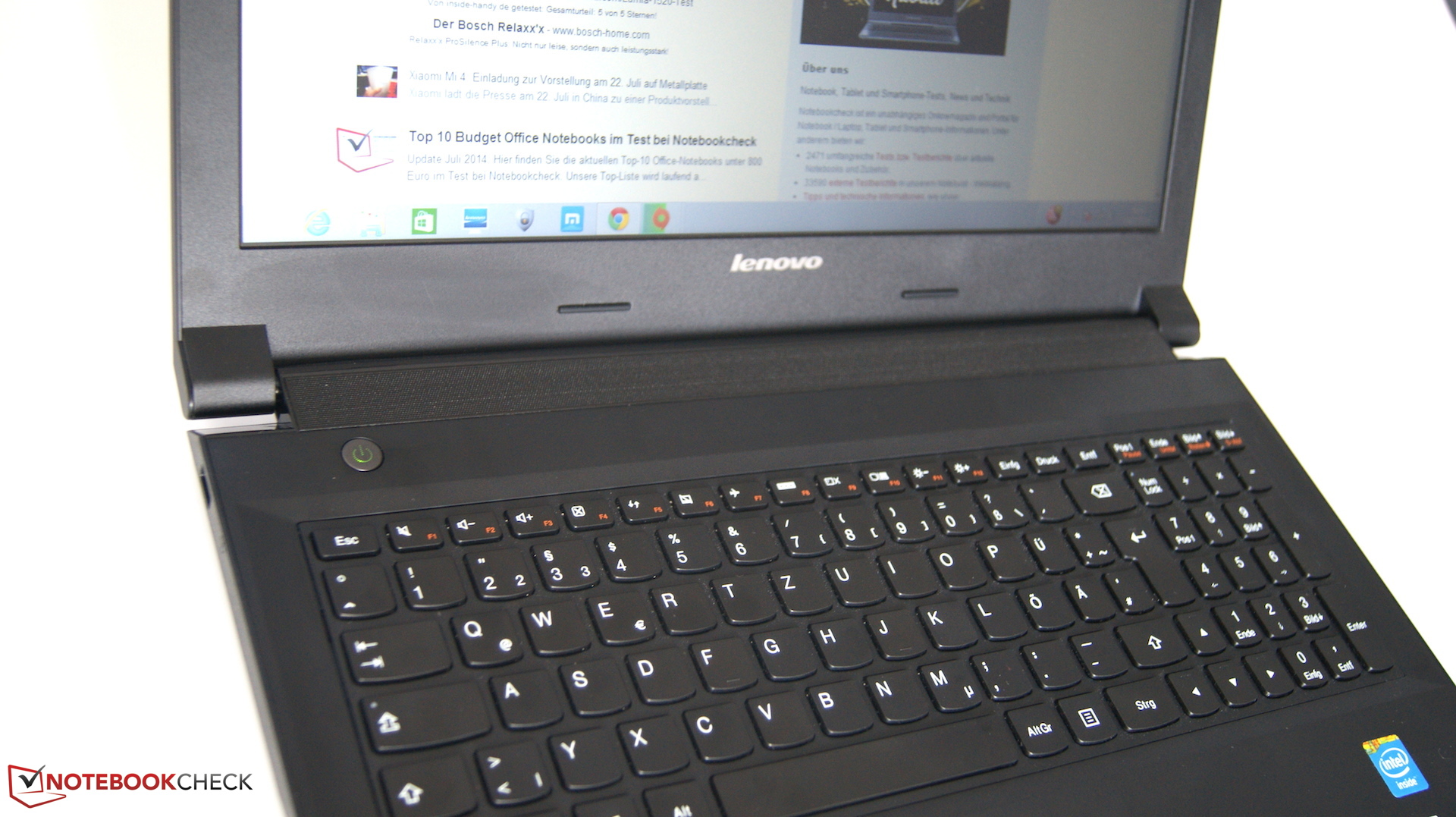 Für die alltäglichen Office-Aufgaben sollte das Lenove B50-30 gewappnet sein. Andere Anwendungsszenarien, wie das Spielen, werden durch die Intel Celeron N2815 (Bay-Trail Dual-Core SoC), sowie die resultierende interne Intel HD Grafikkarte, erschwert. Um einen deutlichen und gleichzeitig kostengünstigen Leistungsschub zu erhalten, soll es zukünftige Versionen mit Intel Pentium N3520-CPU geben. Die Preisdifferenz wird schätzungsweise bei 50 - 70 Euro liegen, ist jedoch noch nicht vom Hersteller angegeben. Auch weitere CPUs, wie die Intel-Core-i-Reihe, können hinzugebucht werden. Sogar die dedizierte Nvidia GeForce 820M findet Platz in der Lenovo-Konfiguration. Die im Standard verbauten 2 GB Arbeitsspeicher sind für heutige Zwecke sehr mager angelegt und bereiteten uns in den Benchmarks große Schwierigkeiten, da Lenovo durch die Fülle der Drittsoftware Großteile des Arbeitsspeichers belegt hat und diese Programme für erfolgreiche Testdurchläufe aus dem Hintergundsspeicher entfernt werden mussten.