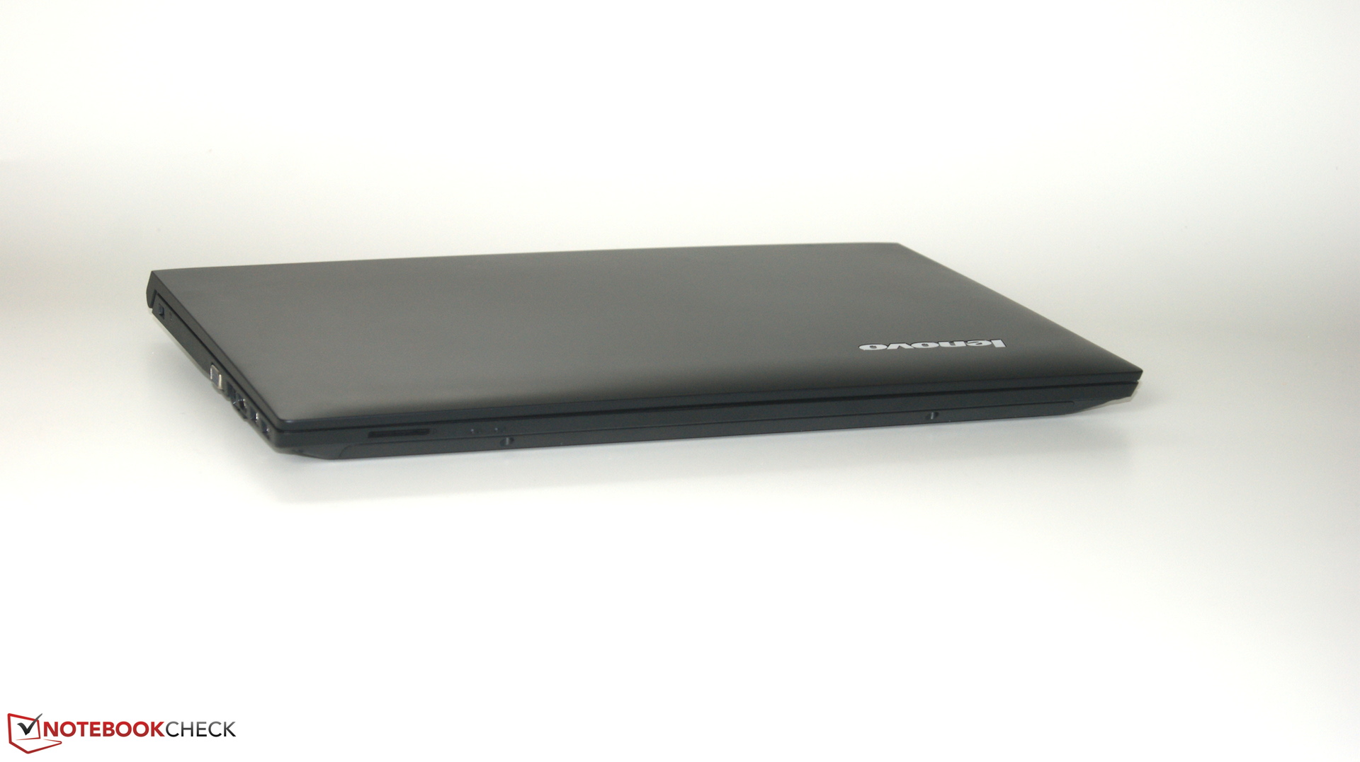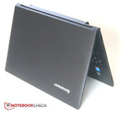 Das Gehäuse erinnert durch den typisch matten Kunstoff an die bekannten Lenovo-Reihen. Auffallend sind vor allem leichte Blaupigmente, mit welchen das Notebook besonders bei starkem Lichteinfall irgendwie interessant aussieht. Die Haptik ist in sich stimmig und außerdem fühlt sich das Testgerät griffig an. Die Verschlusskanten der einzelnen Gehäusekomponenten sind zwar passend positioniert, allerdings uneben. An diesen Stellen lagert sich meist Staub an, welcher nur mühselig entfernt werden kann. Weiterhin ziehen Fingerabdrücke das matte Kunststoffgehäuse des Lenovo magisch an. Sonst liegt das Lenovo, mit seiner recht flachen Abmessung von 28 mm in der Höhe, gut und bequem in der Hand. So ist das Gewicht von 2.225 g (mit Akku) äußerst angenehm für Nutzungen auf dem Schoß. Wartungsarbeiten können über Abnahme der Teilbaseunit, sowie mittels Schrauben für die Abnahme der Tastatur, durchgeführt werden.