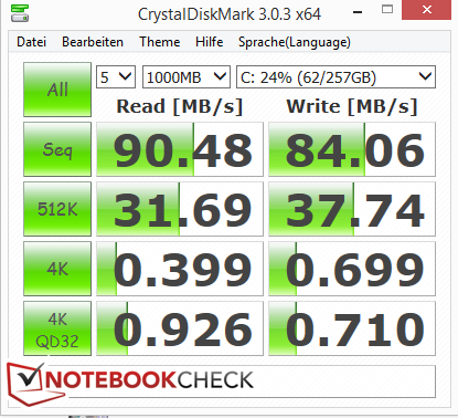 Die verbaute Seagate ST320LT012 besitzt eine Speicherkapazität von 320 GB und arbeitet mit 5.400 Umdrehungen pro Minute. Die im CrystalDiskMark 3.0 erreichten Lese- und Schreibwerte liegen im Durchschnitt dieser Festplattenart. Gravierende Unterschiede der Konkurrenz gibt es hierbei nicht, da keiner auf teureren SSD-Festspeicher setzen kann. Gute Vergleichergebnisse konnten jedoch beim Asus F551MA und Acer Aspire E1-532 mit besseren Lese- und Schreibwerten erreicht werden.