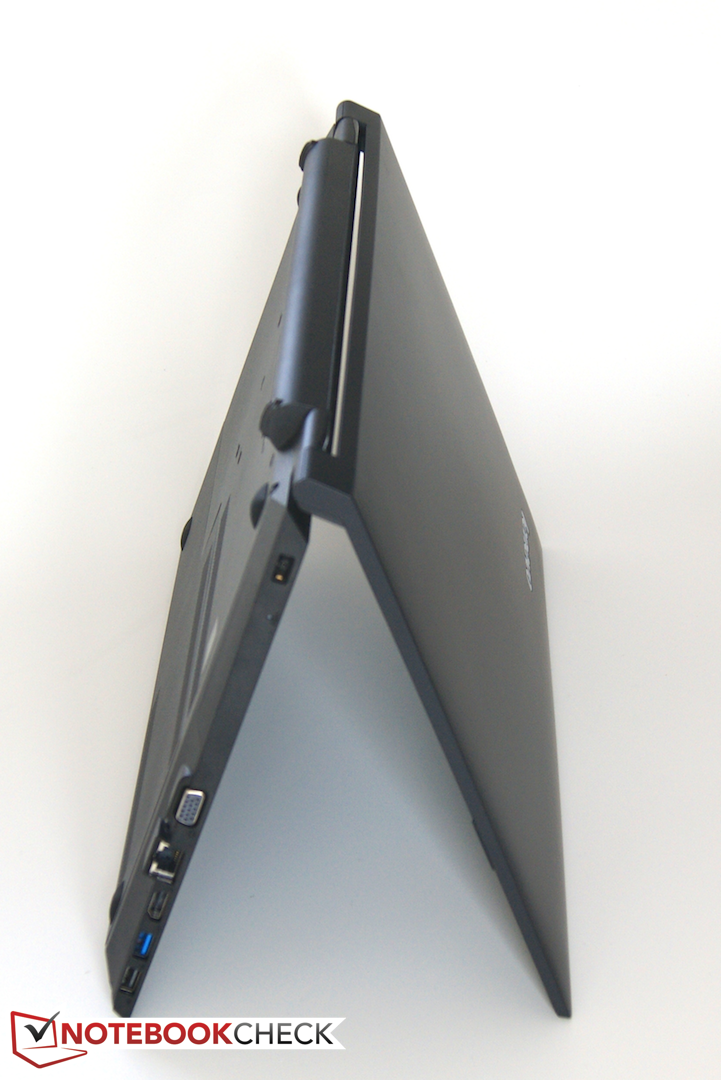 Beim Thema Blickwinkelstabilität fällt besonders auf, dass Farben und Helligkeiten bei Kippbewegungen deutlich verfälscht werden. Der niedrige Kontrast macht hierbei Probleme und so kann zum Beispiel, bei kleinerem Neigungswinkel, schon einmal die Uhrzeit der Windows-Taskleiste schwer zu lesen sein. Der Öffnungswinkel allgemein könnte etwas größer ausfallen und liegt bei etwas unter 135 °.