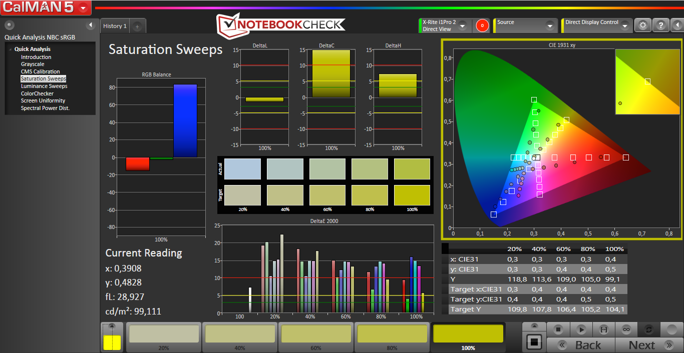 Notwendig für professionelle Bildbearbeitung ist die Abdeckung des AdobeRGB-Raumes, welcher jedoch mit einer Überdeckung von 38,96 % deutlich verfehlt wird. Die Graustufenabweichungen im Calman erreicht einen deltaE-Wert von 12,29. Dieser ist auf jeden Fall zu hoch angesetzt und hat einen deutlichen Blaustich zur Folge. Im ColorChecker-Test liegt die Abweichung ähnlich hoch bei 12,29. Signifikat bessere Werte kann hierbei das Asus F551MA (Grayscale 4.57 dE, Colorchecker 4,7 dE) erzielen.
