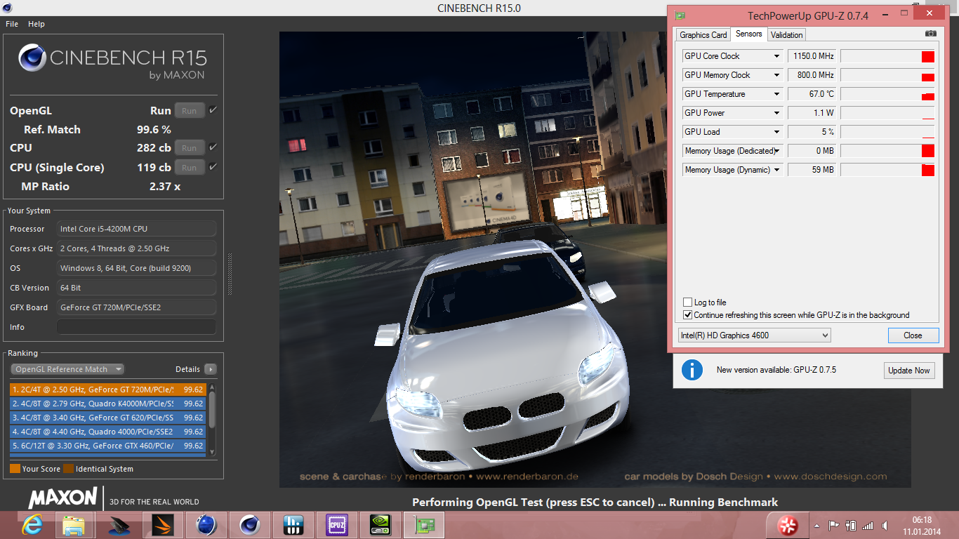 Der Turbo unseres Core i5 4200M (2,5 bis 3,1 GHz) wird in den Tests fast voll ausgefahren und hält sich konstant, auch bei kontinuierlicher Last. Im Akkubetrieb bleibt es nicht bei den guten Scores, der wiederholt ausgeführte Cinebench R11.5 schließt wie folgt ab: Single 1,34 Punkte; Multi 2,86 Punkte; OpenGL (GT 720M) 30,5 fps. Dabei fiel auf: Erst wiederholte Ausführungen führten den OpenGL-Test von 25 auf besagte 30,5 fps.