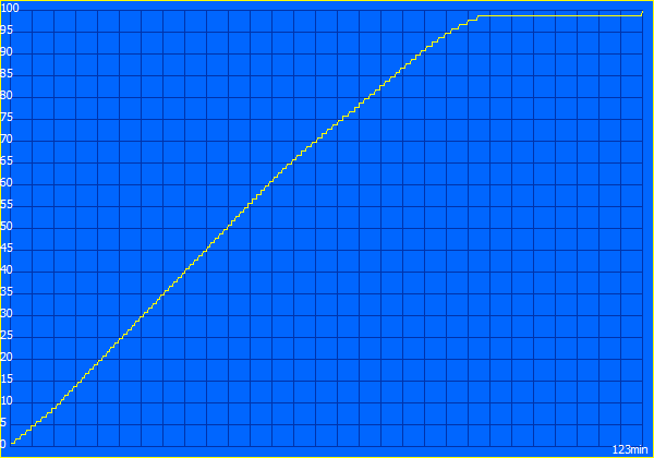 Der DVD-Test gleicht dem WLAN-Test. Nach 2:56 Stunden (176 Minuten) geht der Film aus, den wir mit einer mittlerer Helligkeit von 100 cd/m² abgespielt haben. Bis zur Fortsetzung vergehen 2:03 Stunden. Solange braucht der Akku für eine vollständige Aufladung nach 100% Entladung.