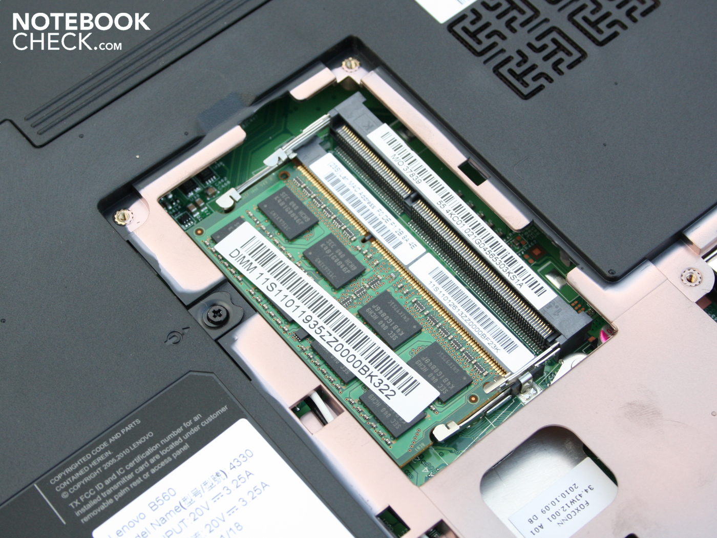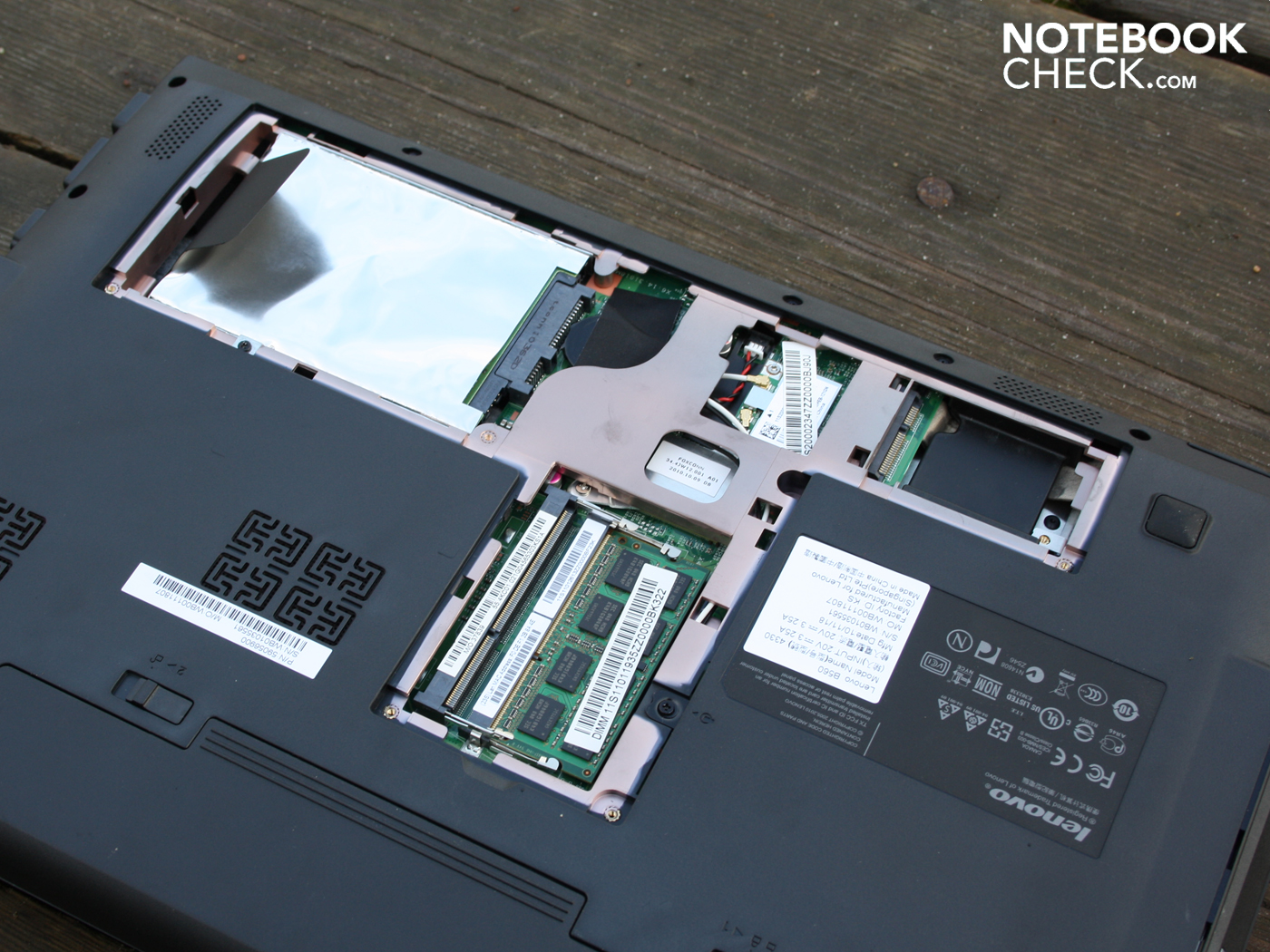 Das Lenovo B560 geht in zwei Details über den Mindeststandard eines Office-Laptops hinaus. Für externe Festplatten gibt es kein USB 3.0, dafür aber eine eSATA/USB Kombination. Moderne Anschlüsse wie USB 3.0 können mangels ExpressCard54- bzw. 34-Slot aber nicht nachgerüstet werden. Zweites Detail ist der unbelegte Mini PCIe Schacht (Full Size). Diese Option taugt aber nur für technisch versierte Anwender, denn das BIOS muss jede hier eingesteckte Erweiterungskarte explizit unterstützen. Im Markt gibt es zahlreiche SSD-Speicher (PCIe Mini Cards) für den Mini PCIe Schacht.