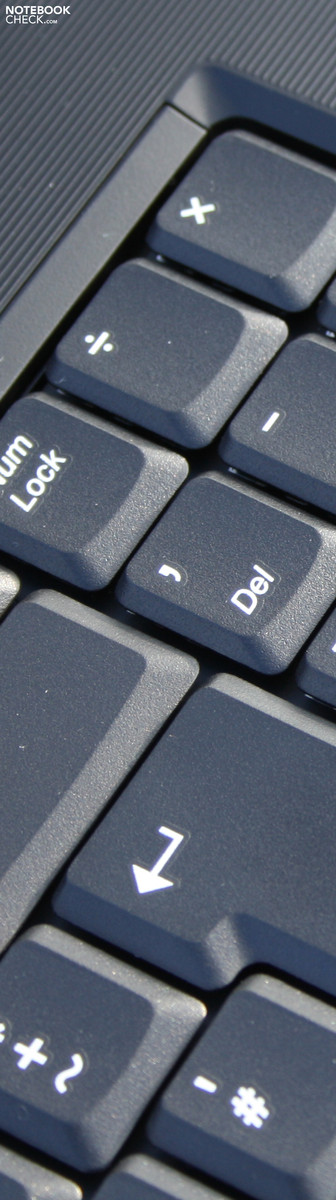 Gut gefällt uns die deutliche, weiße Beschriftung der Tasten. Speziell bei Dämmerlicht bleiben Sie noch gut sichtbar. Die nach unten abgesetzten Richtungstasten und die großen Enter-, Shift- und Backspace-Tasten runden die Eingabe ab. Der Ziffernblock mit seinem abgespeckten Layout missfällt uns jedoch: Das Komma liegt ungünstig über den Ziffern. Das entspricht nicht dem Standard-Layout, wie es Nutzer von Desktop-Tastaturen kennen.