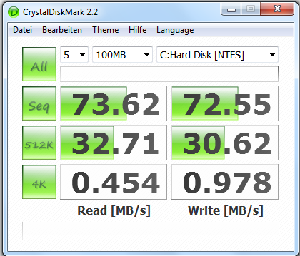 In unserem Testgerät kommt eine HDD von Hitachi (HTS547550A9E384) zum Einsatz, welche mit 500 GB viel Speicher für Dokumente, Bilder und MP3s bietet. Sie dreht mit leisen 5200 Umdrehungen pro Minute. Dadurch ergibt sich eine, durch HD Tune ermittelte, durchschnittliche Transferrate von 66.6 MB. Damit befindet sie sich in Gesellschaft anderer 5400 U/min Platten, aber auch einiger, zugegeben mäßig schneller, 7200 U/min Platten.