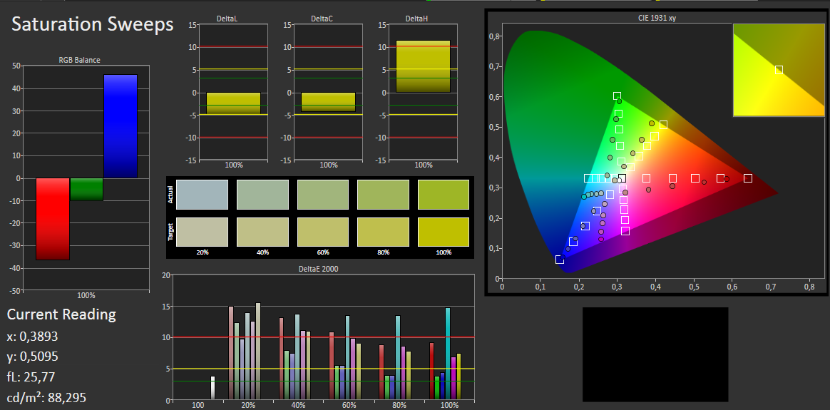 Im Auslieferungszustand haben wir den Bildschirm vermessen (Zielfarbraum sRGB) und konnten dabei deutliche DeltaE-2000-Abweichungen bei den Graustufen und Cyan feststellen. Bei den Farben Rot, Blau, Magenta und Gelb fällt die Abweichung moderater aus (DeltaE zwischen 5 und 8). Nur Grün und Weiß liegen im Zielbereich (DeltaE kleiner 5). Das Display besitzt einen Blaustich.