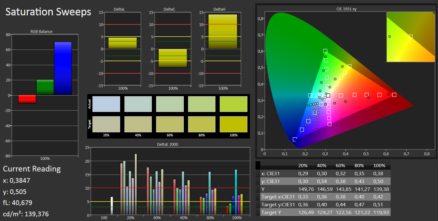 | Delta E Graustufen * | 13.37 | 13.23 1% | 14.22 -6% | 5.23 61% | |