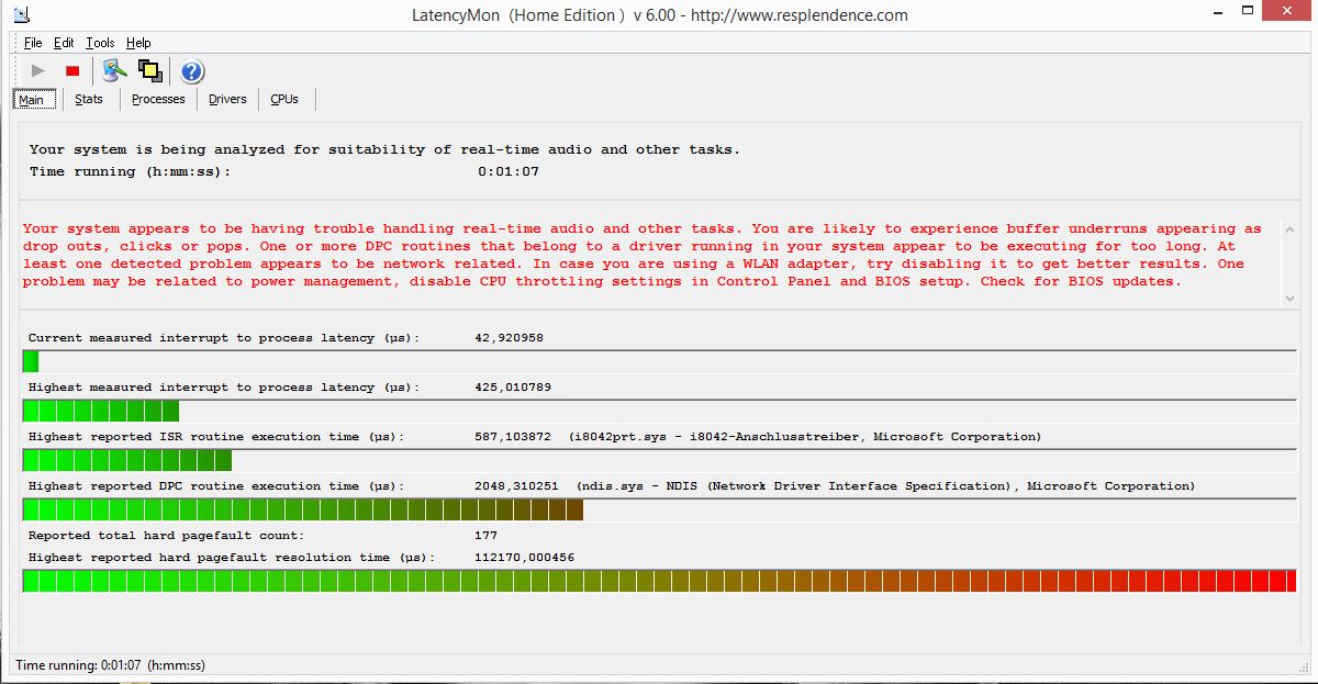 Übrigens: Wie aus dem Screenshot in der unteren Reihe rechts ersichtlich, diagnostiziert LatencyMon Audio-Dropouts. Für Realtime-Monitoring, Videoschnitt etc. scheint also in Verbindung mit dem B70-80 ein externes Audiointerface angeraten.