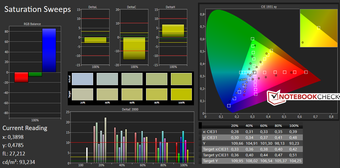 Im nächsten Schritt werfen wir einen Blick auf die CalMAN-Analyse. Schon rein subjektiv betrachtet fällt der deutliche Blaustich unseres Testgeräts auf. Die DeltaE-Abweichungen der Farben (12,25) und der Graustufen (13,19) fallen ebenfalls eher schlecht aus, was für ein günstiges TN-Panel nicht anders zu erwarten ist.
