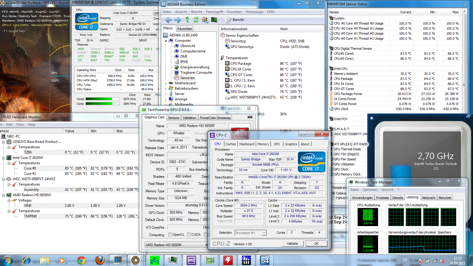 Im G770 von Lenovo kommt eine Intel Core i7 2620M mit 4 MByte Level 3 Cache zum Einsatz. Dieser Dual-Core-Prozessor basiert auf der Sandy-Bridge-Architektur (mit 32-nm-Herstellungstechnologie, 624 Millionen Transistoren auf einer DIE-Size von 149 mm²). Die CPU von Intel kann, dank HyperThreading-Unterstützung, vier Threads gleichzeitig bearbeiten. Die Core i7 2620M besitzt einen Grundtakt von 2,7 GHz und kann durch die Turbo-Boost-Technologie einzelne Kerne automatisch auf bis zu 3,4 GHz übertakten. Voraussetzung ist eine ausreichende Kühlung der CPU. Je höher die Temperaturen im Kern anstiegen, desto weniger kam der Turbo-Modus zum Einsatz.