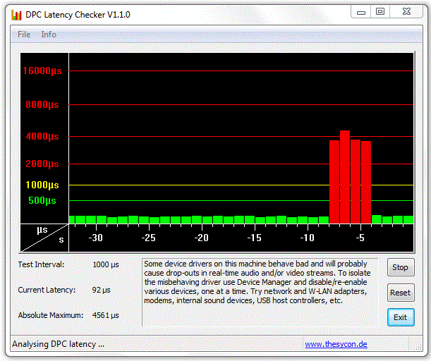 Mit dem Programm DPC Latency Checker testen wir an den Schnittstellen mögliche Latenzprobleme, durch die Synchronisationsfehler bei externer Hardware auftreten können.