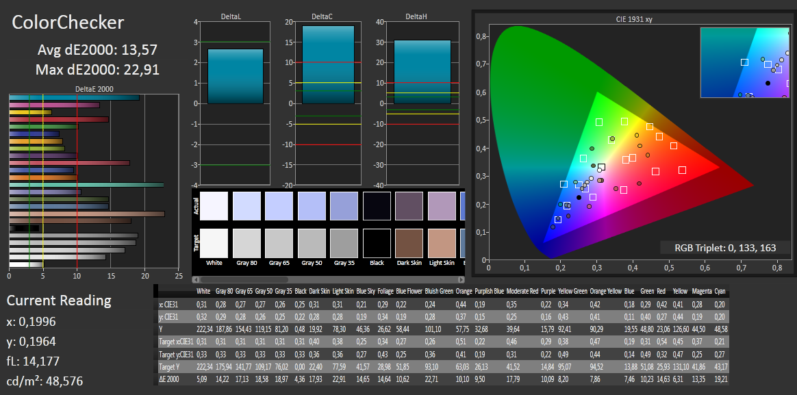 ΔE ColorChecker Calman: 13.57 | ∀{0.5-29.43 Ø4.78}