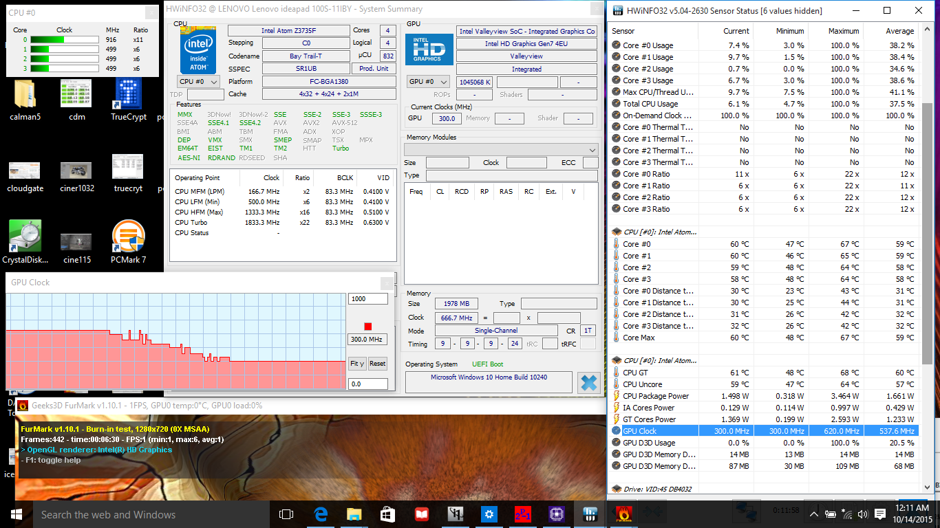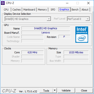 Die integrierte Bay-Trail-GPU unterscheidet sich je nach Prozessor. Bei unserem Lenovo arbeitet die GPU in den meisten Fällen mit stabilen 620 MHz, allerdings gibt es keinen GPU-Boost.