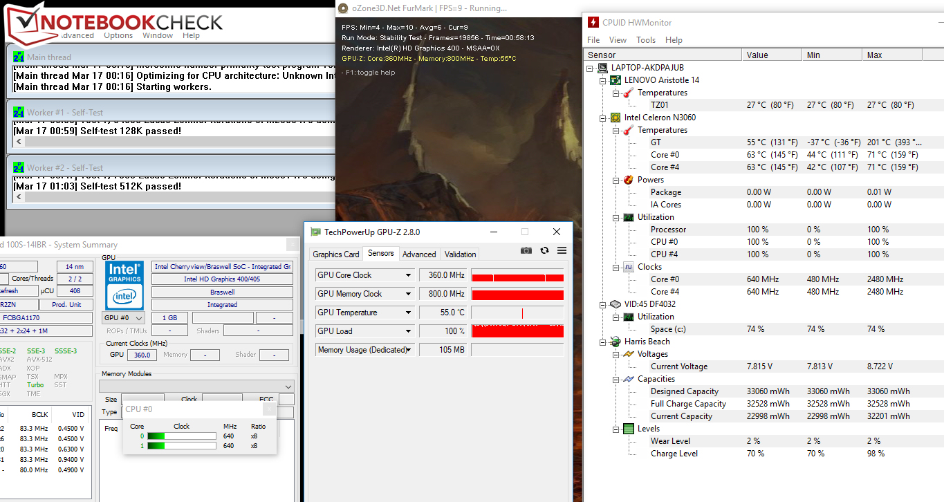 Unseren Stresstest durchläuft das Ideapad im Netz- und im Akkubetrieb auf die gleiche Weise. In den ersten Minuten des Tests arbeiten CPU und GPU mit recht hohen Geschwindigkeiten. Dann setzt eine Drosselung auf 640 MHz (Prozessor) bzw. 360 MHz (Grafikkern) ein. Die Werte verbleiben für die restliche Dauer des Tests auf diesem Niveau.