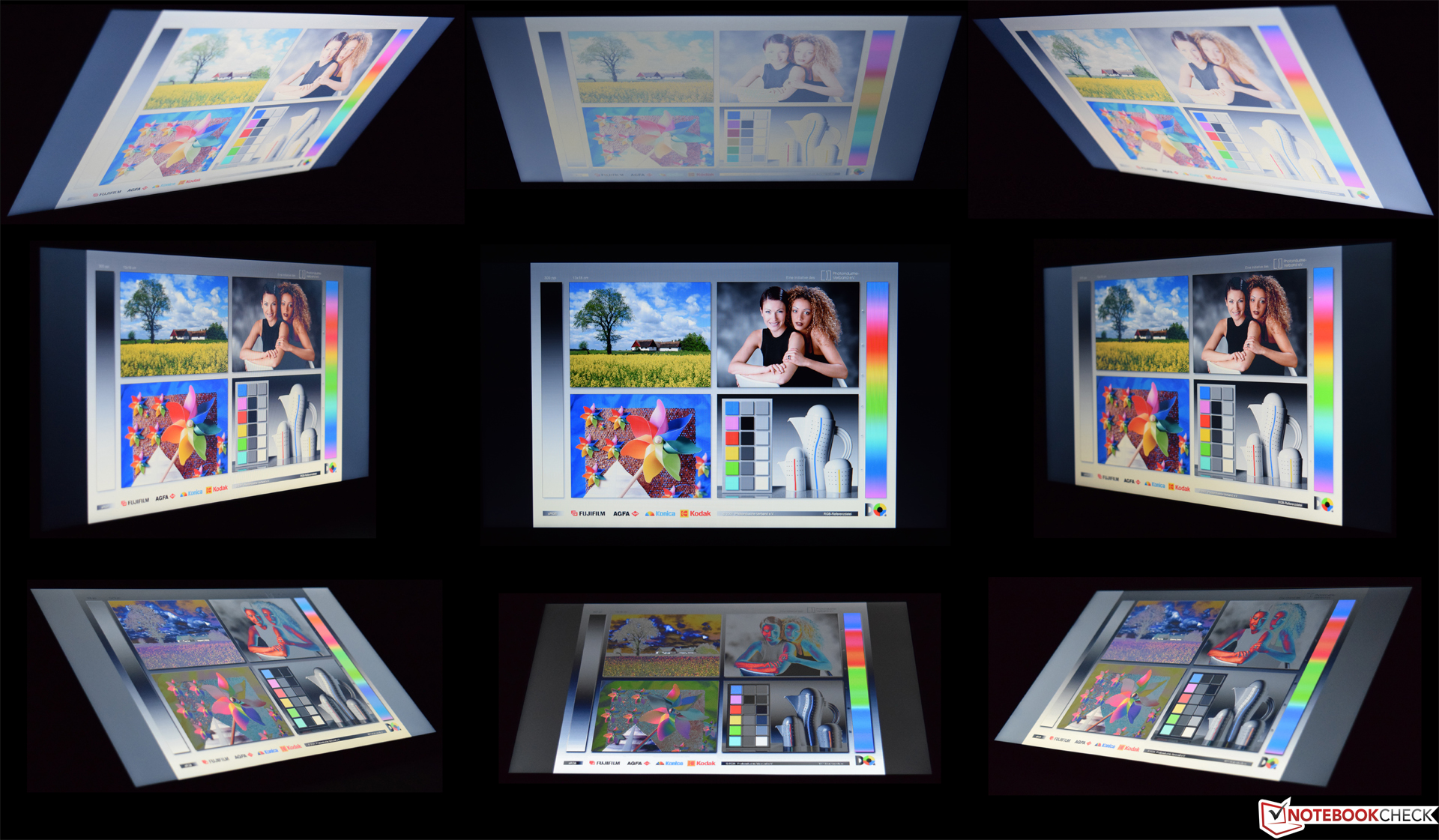 Der Außeneinsatz ist auf Grund der matten Bildschirmoberfläche möglich, wenngleich ein schattiger Platz zu bevorzugen ist. Bei Sonnenschein reicht die geringe Displayhelligkeit einfach nicht aus. Auch beim Blickwinkeltest zeigen sich die Schwächen des TN-Panels deutlich. Eine gute Darstellung ist nur bei den drei mittleren Bildern möglich. Sobald das Display nach vorn oder nach hinten geneigt wird, verfälschen die Farben stark oder werden mit einem deutlich sichtbaren Grauschleier überzogen.