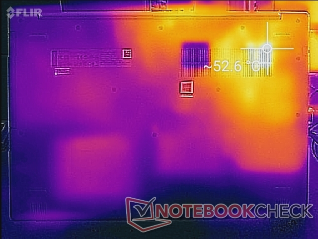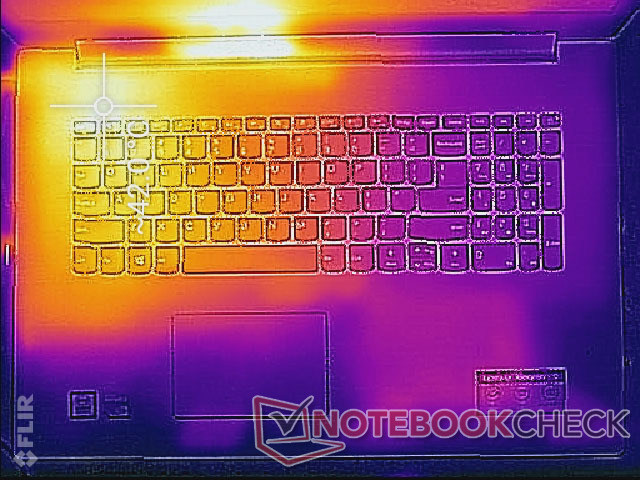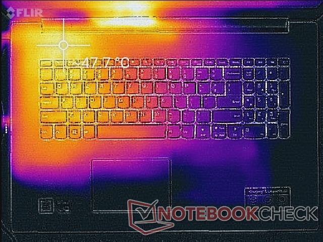 Bei hoher Last, wie zum Beispiel beim Gaming, erreicht die obere linke Hälfte des Systems eine Temperatur von 42-47 °C. Der Rest bleibt mit 25 °C dagegen sehr kühl. Die Temperaturdifferenz ist also beträchtlich. Zu allem Überfluss liegen CPU und GPU auch noch in unmittelbarer Nähe zu den für Gaming häufig benötigten W-A-S-D- und 1-4-Tasten, so dass man sich besser auf verschwitzte Finger einstellen sollte.