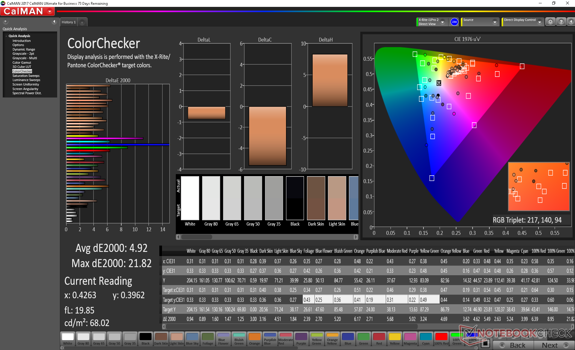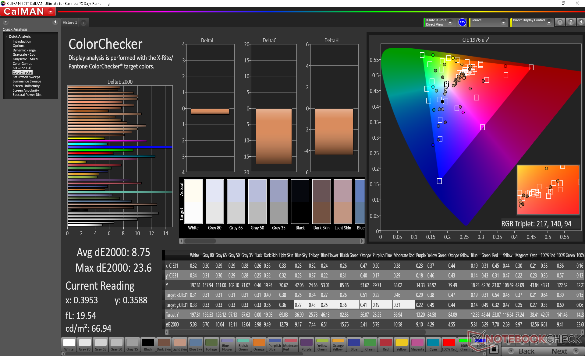 Auch die weitergehenden Messungen deuten sehr stark darauf hin, dass es sich hier um ein äußerst günstiges Panel handelt. Die Graustufen sind ungenau, die Farbtemperatur ist zu kühl und die Farbdarstellung ist weder sonderlich gut noch auch nur annähernd akkurat. Mittels Kalibrierung konnten wir Graustufen und Farbbalance drastisch verbessern, das daraus resultierende ICC-Profil steht wie immer oben zum Download zur Verfügung. An der Farbgenauigkeit konnten wir allerdings nichts tun, da die sRGB-Abdeckung hierfür schlichtweg zu gering war.