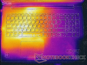 Im linken Bereich erwärmte sich das Notebook spürbar mehr als im rechten Bereich, da hier die CPU und das Kühlsystem liegen. Bei hoher Last betrug der Temperaturunterschied bis zu 8 °C. Glücklicherweise ist dies bei Low-Power-Systemen selten problematisch und auch hier war die Benutzung nie unangenehm oder gar unkomfortabel. Insgesamt ähnelten die Oberflächentemperaturen der Ryzen-5-Variante des IdeaPad 330.