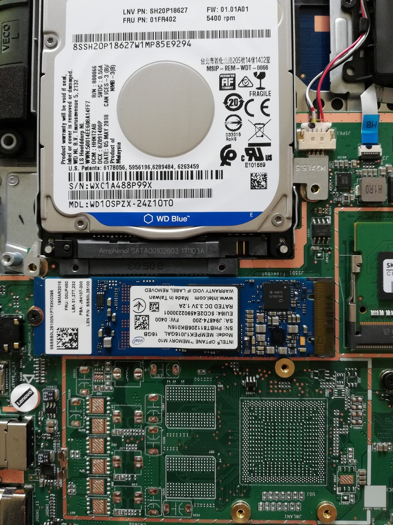 Die Bodenplatte des IdeaPad 330S lässt sich abnehmen, nachdem zehn Schrauben an der Unterseite des Geräts gelöst wurden. Daraufhin ist der direkte Zugriff auf das Innenleben frei und der Lüfter kann gereinigt, die Festplatte getauscht oder der Akku gewechselt werden. Das Mainboard wird von einem schwarzen Blech verdeckt, welches durch vier Schrauben gesichert ist. Werden diese entfernt, kann das Blech ebenfalls abgenommen werden und der Zugriff auf die Optane-Einheit und den RAM wird frei. In unserem Testgerät sind insgesamt 8 GB RAM verbaut, austauschbar ist aber nur ein 4 GB großer Baustein.