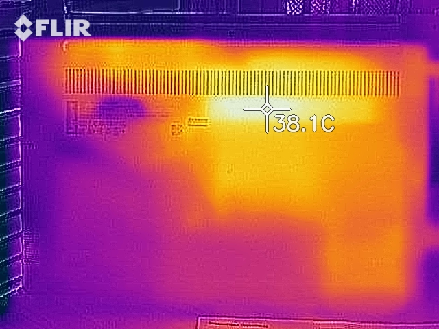 (+) Auf der Unterseite messen wir eine maximalen Wert von 39.7 °C (im Vergleich zum Durchschnitt von 36.8 °C).