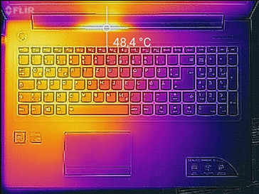Unseren Stresstest (Prime95 und Furmark laufen für mindestens eine Stunde) durchläuft das Ideapad im Netz- und im Akkubetrieb auf unterschiedliche Weisen. Im Akkubetrieb springen die Geschwindigkeiten von CPU (400 MHz//2,7 GHz) und GPU (135 MHz//600 bis 700 MHz) zwischen hoch und niedrig hin und her. Im Netzbetrieb arbeitet der Prozessor mit konstanten 2,7 GHz. Die Arbeitsgeschwindigkeit des Grafikkerns pendelt zwischen 950 und 1.100 MHz. Sonderlich stark erwärmt sich der Rechner nicht. An allen Messpunkten liegen die Temperaturen klar unterhalb der Vierzig-Grad-Celsius-Marke.