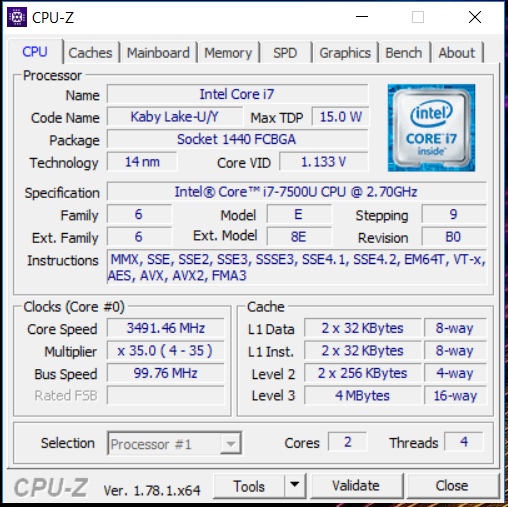 Kaby Lake hat nun auch Einzug in Lenovos 13,3-Zöller gehalten. Die Firma setzt auf den Zweikernprozessor Intel Core i7-7500U. Die CPU gehört zu den sparsamen ULV-Modellen (TDP: 15 Watt). Auf technischer Seite unterscheiden sich Kaby Lake und der Vorgänger Skylake praktisch nicht. Intel hat bei Kaby Lake in erster Linie Optimierungen vorgenommen und die Taktraten nach oben geschraubt. Der Core-i7-Prozessor arbeitet mit einer Basisgeschwindigkeit von 2,7 GHz. Mittels Turbo ist eine Steigerung auf bis zu 3,5 GHz (beide Kerne) möglich. Die CPU durchläuft nur die von uns durchgeführten Single-Thread-Tests mit voller Kraft. Während der Durchführung von Multi-Thread-Tests wird die Geschwindigkeit schon nach wenigen Sekunden auf 2,9 bis 3 GHz gesenkt.