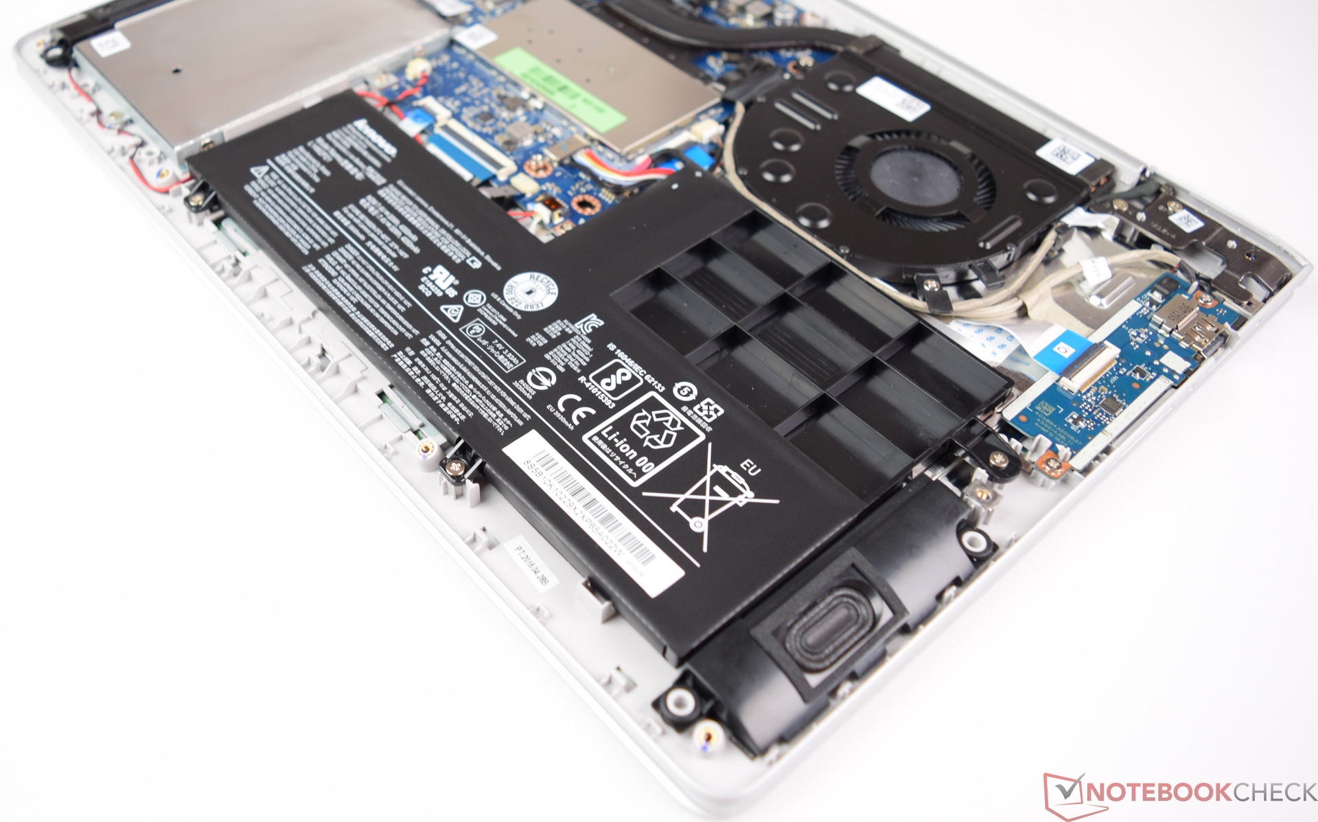 Unter Volllast reicht eine Akkuladung für 1 Stunde und 40 Minuten. An dieser Stelle hätten wir uns gewünscht, dass sich Lenovo dieses Kritikpunkts des Ideapad 500S-14ISK annimmt und das Ideapad 510S-14ISK mit einem etwas größeren Akku versieht. Aber weit gefehlt, Lenovo bleibt bei dem 30-Wh-Modell. An Platz innerhalb des Gehäuses mangelt es jedenfalls nicht.