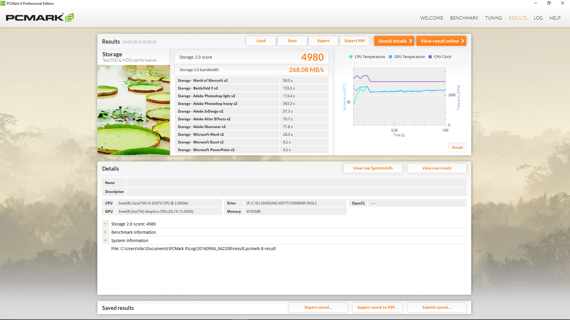 Lassen wir nur das Programm Prime95 laufen, erreicht der Prozessor eine Höchsttemperatur von 87 °C. Hierbei muss die CPU sich nicht die Leistung mit der GPU teilen, sodass die komplette Leitung (28 Watt) zur Verfügung steht. Zu Beginn liegt die Taktfrequenz bei 3,3 GHz, welche sich im weiteren Verlauf auf stabile 2,9 GHz einpendelt. Thermales Throttling haben wir nicht feststellen können. Direkt im Anschluss an den Stresstests wurde der 3DMark-11-Benchmark erneut durchgeführt. Das Ergebnis war knapp 100 Punkte geringer als ein Benchmark direkt nach dem Kaltstart.