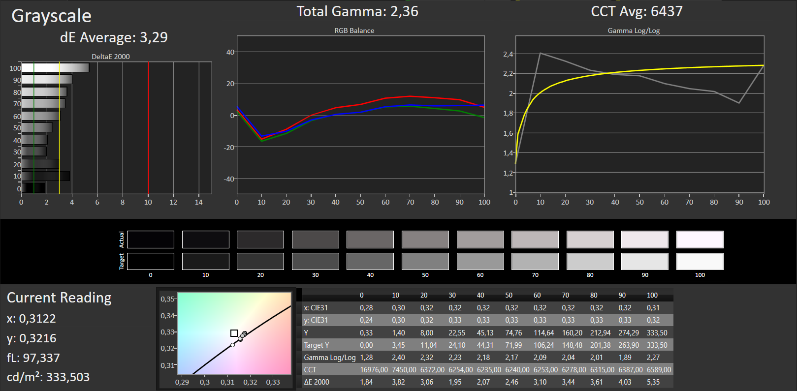 ΔE Greyscale Calman: 3.29 | ∀{0.09-98 Ø5}