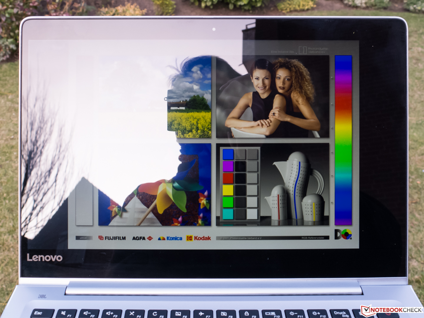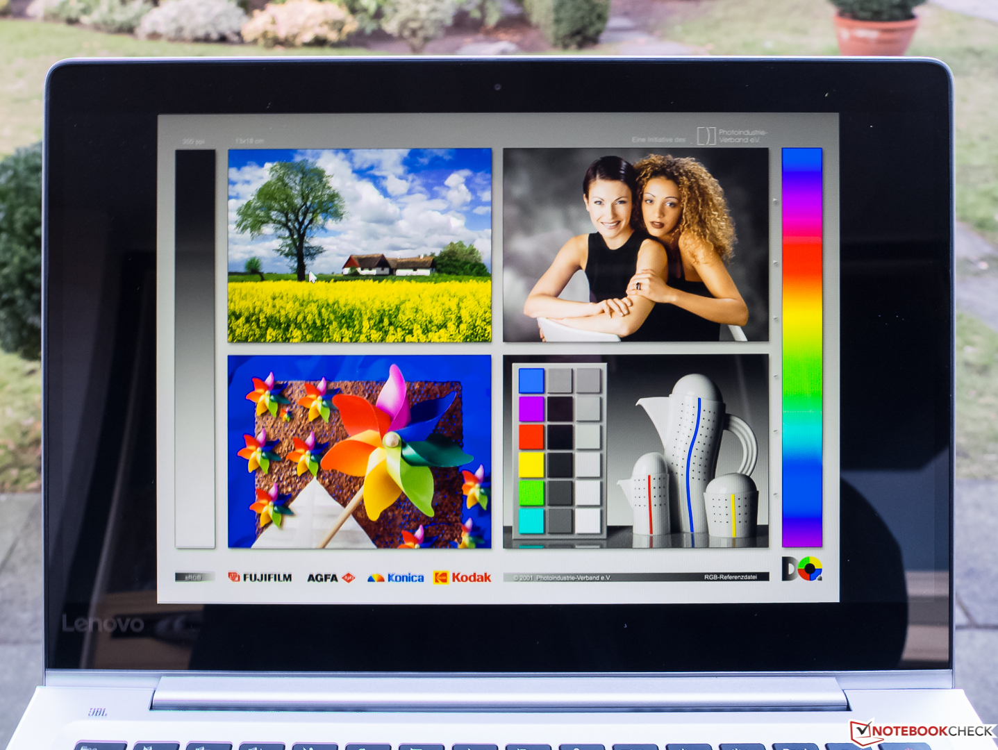 Zum Einsatz kommt ein glänzendes IPS-Display mit 1.920 x 1.080 Pixeln (Full-HD, 16:9). Im Hinblick auf die Bildschirmgröße von 13,3 Zoll hätte eine höhere Pixeldichte als 166 ppi auch keinen Sinn ergeben. Die Bildschärfe ist einwandfrei. Mit seiner gleichwohl sehr guten Maximalhelligkeit von 306 cd/m² landet das Testgerät im Feld zwar nur auf dem vorletzten Platz, das führende Acer Swift 7 ist aber auch nicht bedeutend heller. Unterdurchschnittlich präsentiert sich die gemessene Ausleuchtung von 81 %. Schaut man sich in einem dunklen Raum ein übrigens recht satt wirkendes Schwarzbild an, macht die Fläche einen weitgehend homogenen Eindruck, allerdings ist besonders in der unteren linken Ecke ein in der Praxis nicht auffälliges Durchscheinen der Hintergrundbeleuchtung zu beobachten. Alternative Displays hat Lenovo nicht im Angebot.