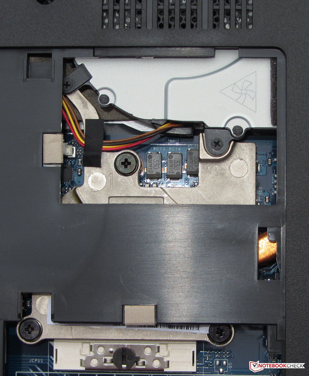Eine große Klappe auf der Unterseite des Geräts gibt den Zugriff auf die Festplatte, den Arbeitsspeicher und das WLAN-Modul frei. Zwei Arbeitsspeicherbänke stehen dem Nutzer zur Verfügung. Unser Test-Notebook ist mit einem vier-Gigabyte-Modul bestückt. Das Notebook unterstützt maximal 8 GB Arbeitsspeicher. Die Festplatte ließe sich mit wenigen Handgriffen austauschen. Man sieht hinter der Wartungsklappe auch den Lüfter, allerdings besteht keine Möglichkeit diesen zu reinigen. Eine Reinigungmöglichkeit hat Lenovo aber nicht gänzlich vergessen. Die Lenovo Energie-Management-Software enthält eine Funktion names "Ventilator-Staubabsaugung". Wird diese aktiviert, soll sie Staubablagerungen aus dem Kühlsystem herausblasen. Wie effektiv diese Funktion ist, wird sich mit der Zeit zeigen müssen.