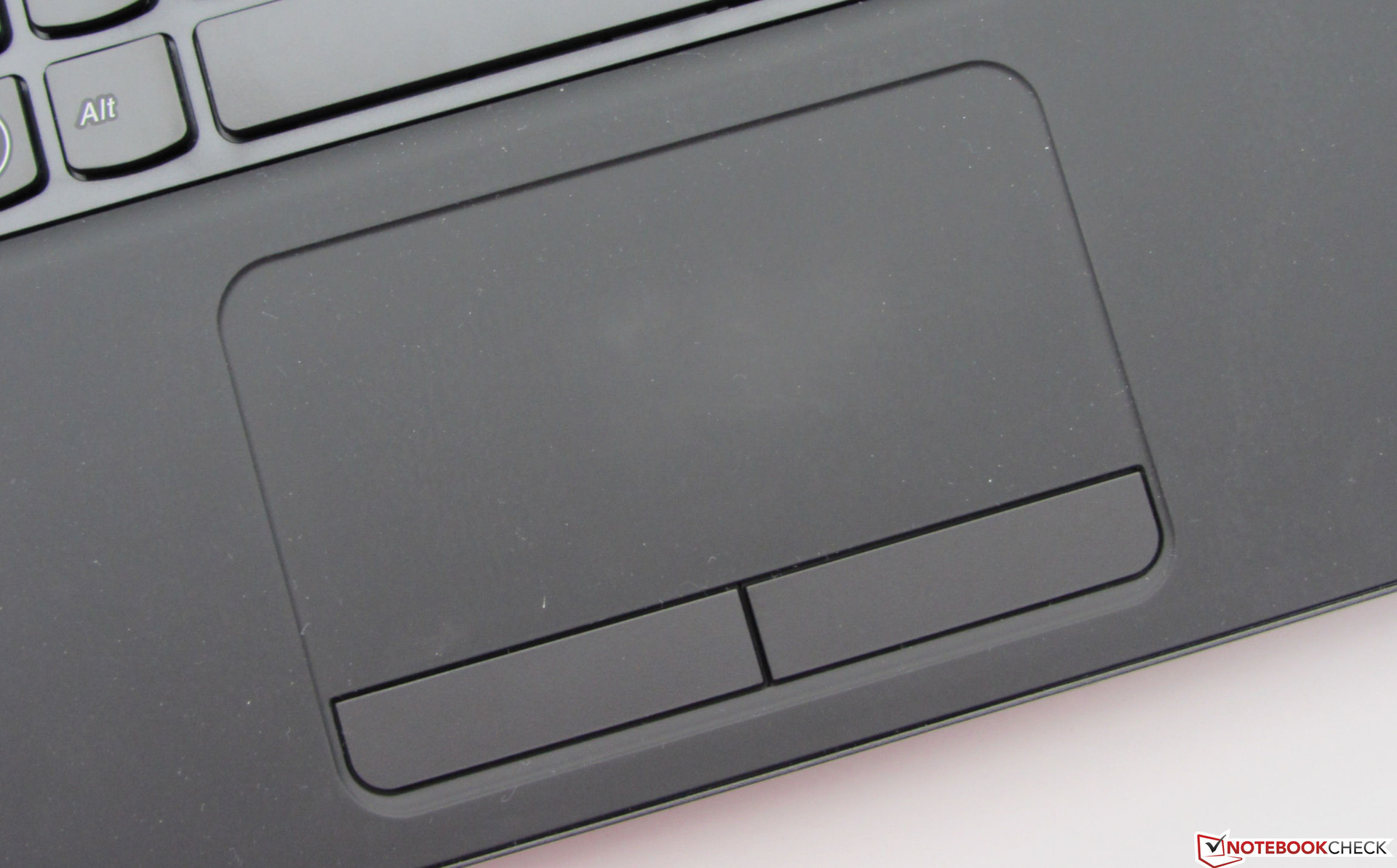 Das Touchpad des Notebooks ist mit 10,2 cm x 5,4 cm großzügig dimensioniert. Es sitzt leicht vertieft in der Handballenablage und ist - wie die Handballenablage selbst - mit einer Gummischicht überzogen. Gleitet man mit dem Finger über die Oberfläche, sollte man diesen nicht zu fest auf das Touchpad drücken. Dann bremst die Gummischicht den Finger und erschwert das Gleiten. Der rechte Rand des Touchpads dient als Scrollleiste, ist aber nicht optisch oder haptisch hervorgehoben. Das Touchpad ist multitouchfähig. Funktionen wie beispielsweise das Zoomen per Zweifingergeste stehen damit zur Verfügung. Unterhalb des Touchpads sitzen die beiden Maustasten. Beide besitzen einen klaren Druckpunkt und einen kurzen Hub.