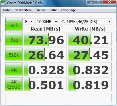 Die Hitachi-Festplatte (320GB, 5400U/Min) bringt bringt nur unterdurchschnittliche Datendurchsätze zustande. Der HDD-Score des PCMark Vantage nennt 2.787 Punkte, was selbst für 5400 RPM ein geringer Wert ist. HD-Tune (60 MB/s Lesen) und Crystal Disk Mark 3.0 (74 MB/s Lesen) ermitteln im Einklang niedrige Werte.