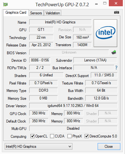In dem Ideapad kommt Intels HD Graphics (Ivy Bridge) Grafikkern zum Einsatz. Er unterstützt DirectX 11 und arbeitet mit Geschwindigkeiten von 350 bis 1.100 MHz. Intel verwendet die Bezeichnung HD Graphics auch für die entsprechende GPU der Sandy-Bridge-Generation. Allerdings ist die Ivy-Bridge-Variante leistungsfähiger. Sie ist zwischen der HD Graphics 2000- und der HD Graphics 3000- GPU anzusiedeln.