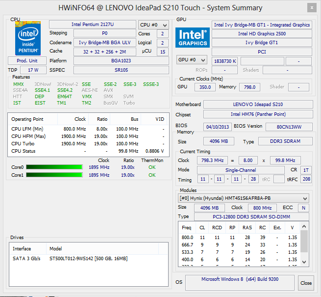 Lenovo stattet das Ideapad mit einem Pentium 2127U Prozessor aus. Dieser Zweikernprozessor gehört der Ivy-Bridge-Prozessorgeneration an. Er arbeitet mit einer Geschwindigkeit von 1,9 GHz. Einen Turbo gibt es nicht. Es handelt sich bei dem Pentium um einen ULV-Prozessor. Diese CPUs werden mit einer niedrigeren Spannung betrieben, wodurch sie relativ wenig Energie verbrauchen. Intel nennt für den Pentium eine TDP von 17 Watt.