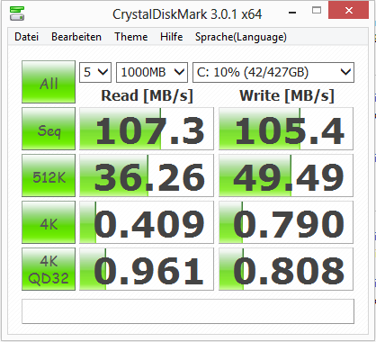 Als Datenspeicher dient eine Festplatte aus Seagates Momentus-Thin-Serie. Sie besitzt eine Kapazität von 500 GB und arbeitet mit 5.400 Umdrehungen pro Minute. CrystalDiskMark meldet eine Lesegeschwindigkeit von 107,3 MB/s. HD Tune liefert eine durchschnittliche Transferrate von 83,5 MB/s. Insgesamt zeigt die Festplatte gute Resultate. Besonders die 4k-read-Werte wissen zu gefallen.
